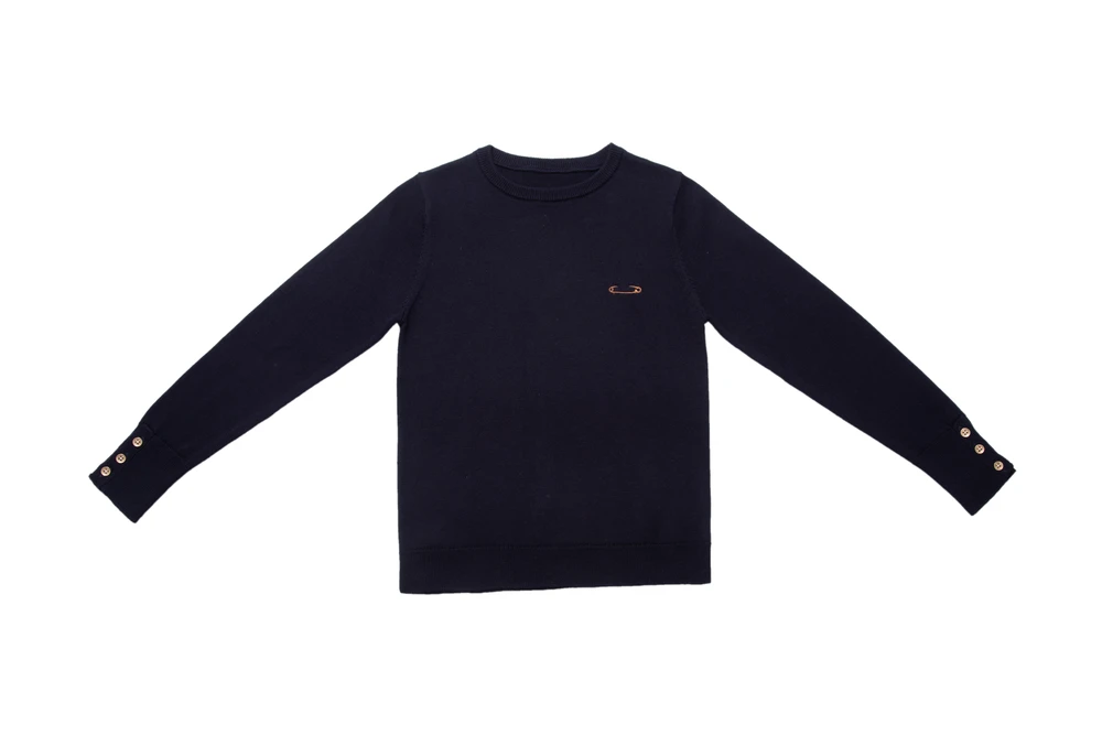 סריג כחול עם רקמת סיכה וכפתורי זהב בשרוול