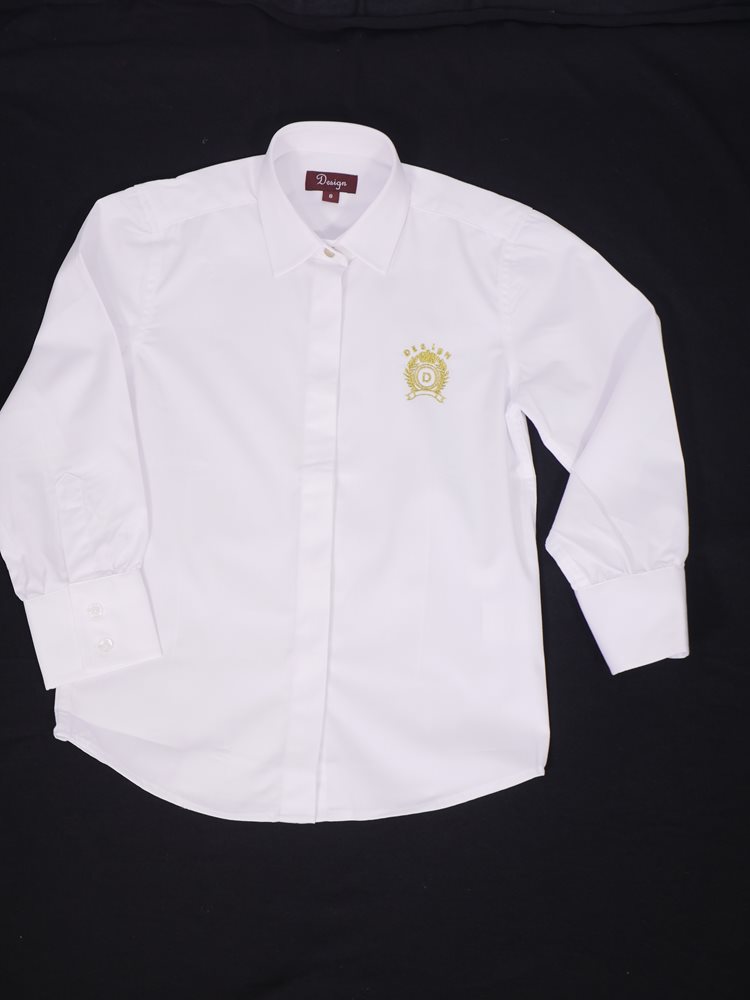 חולצה מכופתרת בצבע לבן, עם רקמה בצבע זהב. 70% כותנה בד נעים ואיכותי.