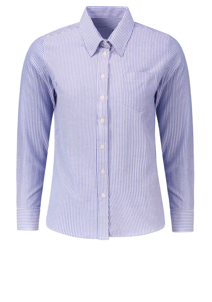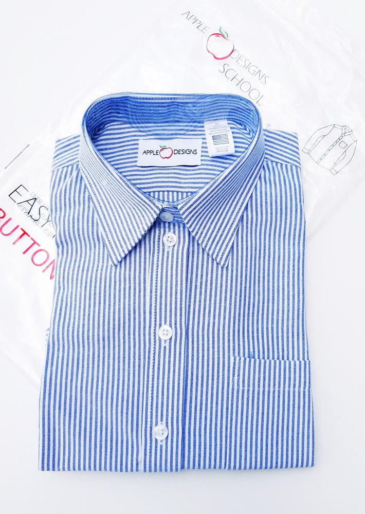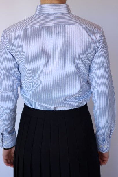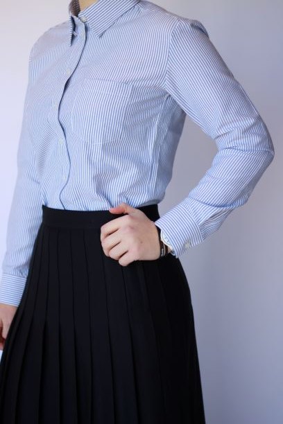 חולצה מכופתרת, בדוגמת פסים בצבעי תכלת לבן. בתוספת כיפתור נסתר בצוארון